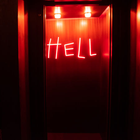 The theme was immediately apparent. After a quick and easy check-in, I lugged my suitcase to the elevators, where one was outfitted with gold-crested mirrors and soft, heavenly light while the other sported black walls and a red neon sign that read simply: HELL— as my luck would have it, the latter lift opened for me.